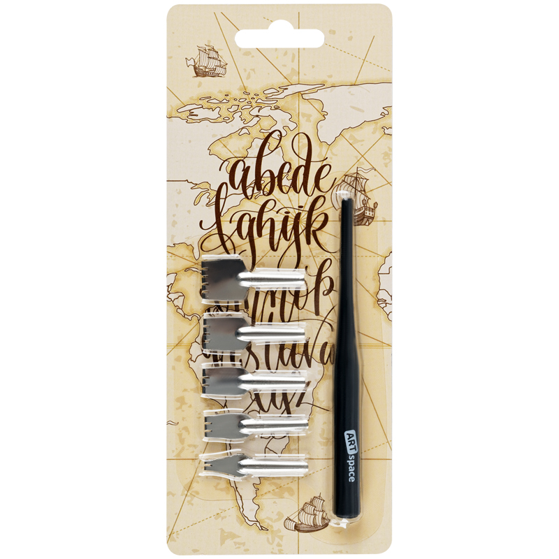 Набор плакатных (постерных) перьев разной ширины наконечников. В наборе 5 перьев разных размеров: 4, 8, 10, 12. 15, и удобный эргономичный пластиковый держатель с "Soft-touch" покрытием. Позволяют наносить линии разной толщины и нажима. Идеально подходят для оформительских работ, написания текстов крупным шрифтом, и рисования.