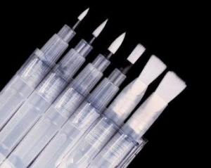 Синтетический наконечник кисти сделан из высококачественного нейлонового волокна японского производства, а корпус – из мягкого пластика, при нажатии на который вода из резервуара поступает к ворсу. Необходимое количество воды точно дозируется благодаря специальному клапану.