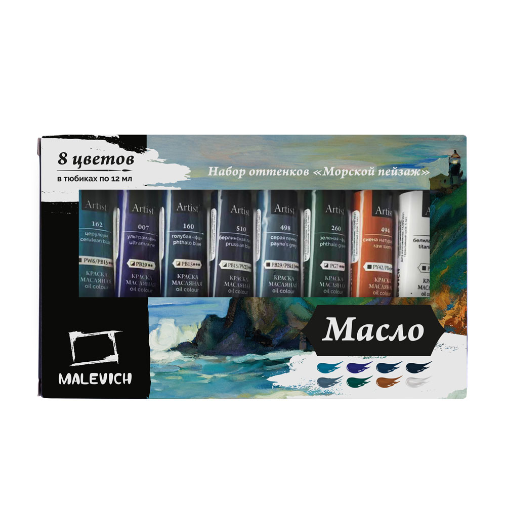 Набор масляных красок Малевичъ, морской пейзаж, 8 цветов по 12 мл