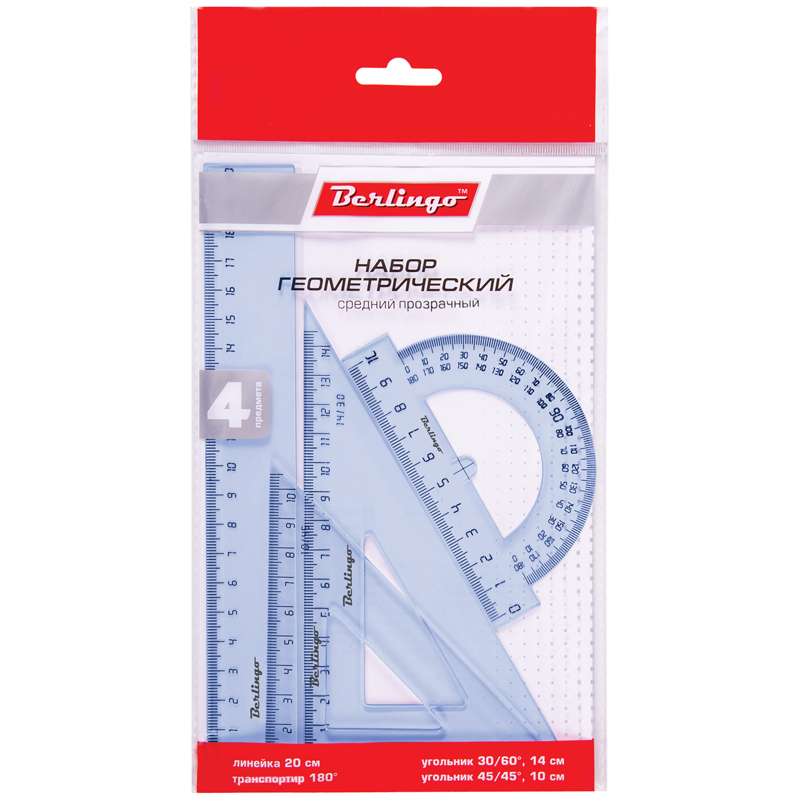 Н-р геометрич. 4 пр. средн. прозрачн. (угольн. 2шт, лин. 20см, тр-р) НЧ-30525