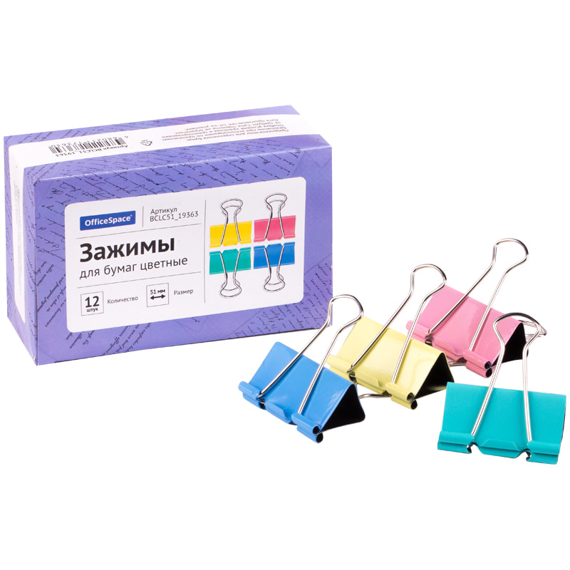 Зажим д/бумаг 5,1см 12шт/уп. цветной OfficeSpace BCLC51_19363