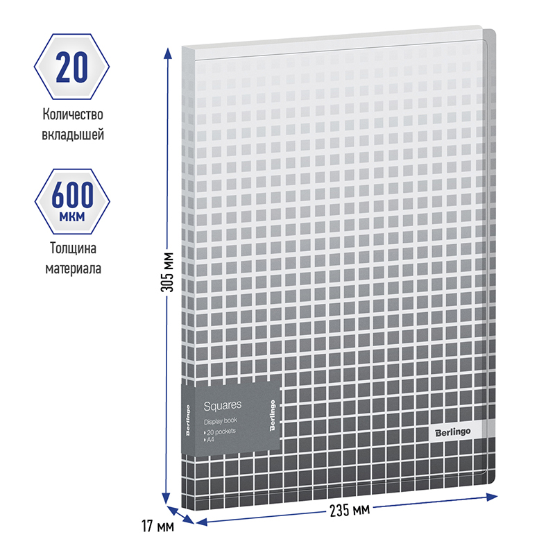 Папка с 20 вкл. Berlingo "Squares", 600мкм, сер.-бел.,с внутр. карманом DB4_20051