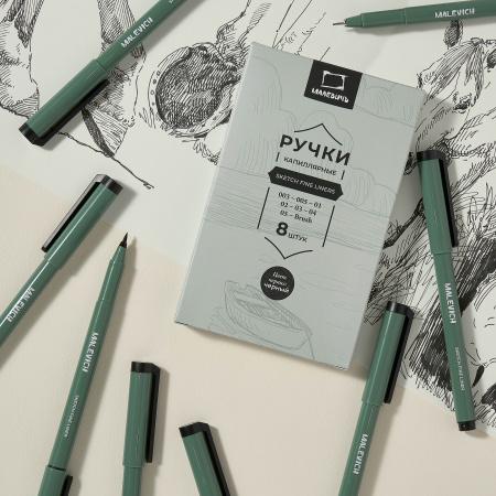 Набор капиллярных ручек линеров Малевичъ, 8шт (003,005, 01,02, 03, 04, 05, кисть)