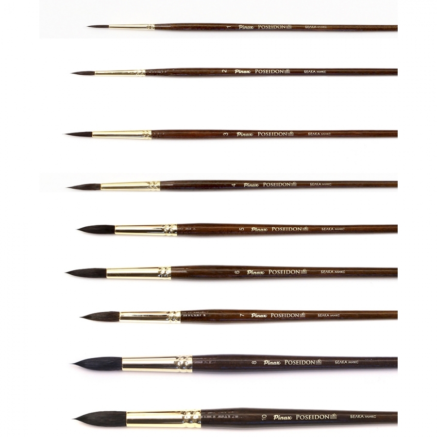 Круглые кисти это кисти классической формы, ворс которых собран в округлый пучок с острием на конце кисти. Мазок такой кисти получается как вытянутый овал, расширяется к вершине и сужается к основанию. Такие кисти которые одинаково хорошо подойдут практически для любой акварельной техники. Кисти серии Poseidon за счет того, что собраны из микса ворса белки и синтетики получаются более упругими и износостойкими чем кисти только из волоса белки. Кроме того стоимость таких кистей будет существенно ниже кистей собранных из белки, а качественные характеристики даже лучше.