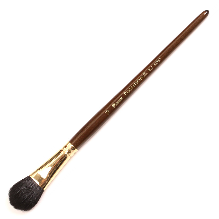 Отлично подойдут как для фоновых заливок так и для фактурных мазков. Кисти представлены в двух видах ворса – белом и черном. В размерах 12, 18 и 24. Размер кисти соответствует ширине обоймы у места где ворс выходит из нее. Белый ворс козы берет в себя несколько больше воды ближе к основанию ворса чем черный. Черный ворс козы хорошо отдает воду по всей длине от основания до кончиков ворса. Такой кистью вы можете довольно быстро работать с большими объемами цвета, а также очень удобно использовать ее для фактурных мазков. Стоит ее хорошо намочить, после чего немного промокнуть и придать ей нужную форму мазка, которым потом можно быстро и экспрессивно писать кроны деревьев, облака, и другие подобные объекты.